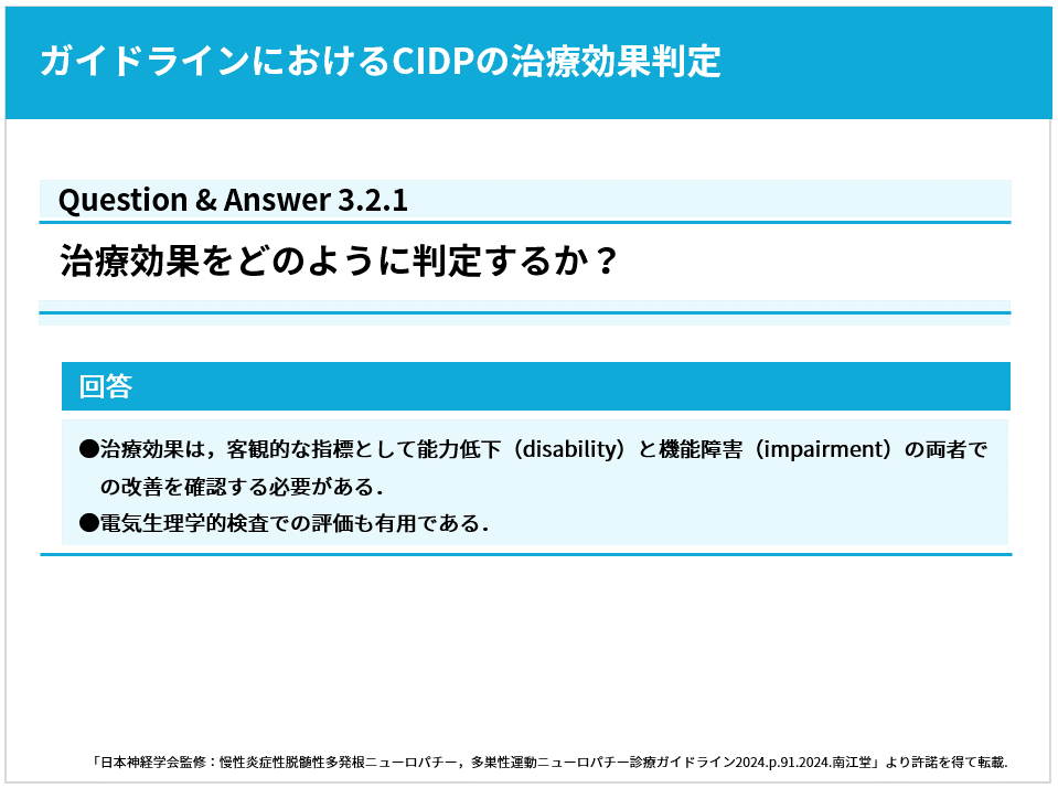 EAN/PNSガイドラインでは、免疫治療への反応性の確認には、客観的な指標として能力低下(disability)と機能障害(impairment)の両者での改善を確認する必要があるとされています1)。