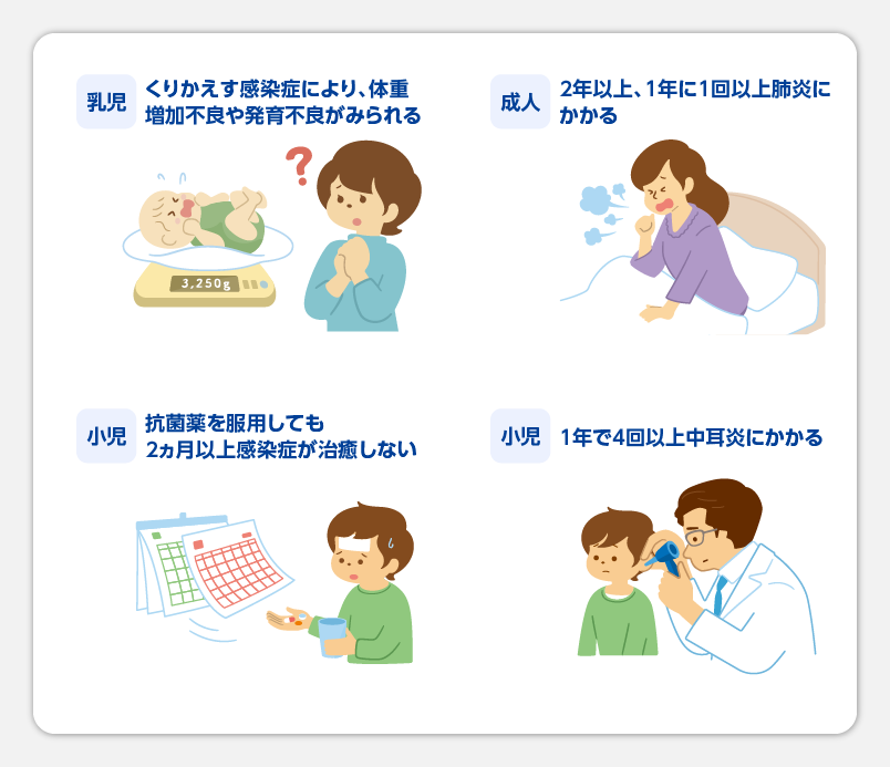 原発性免疫不全症候群(PID)に関する患者さん向け情報サイト「くりかえす 気管支炎・肺炎・中耳炎ナビ」です。