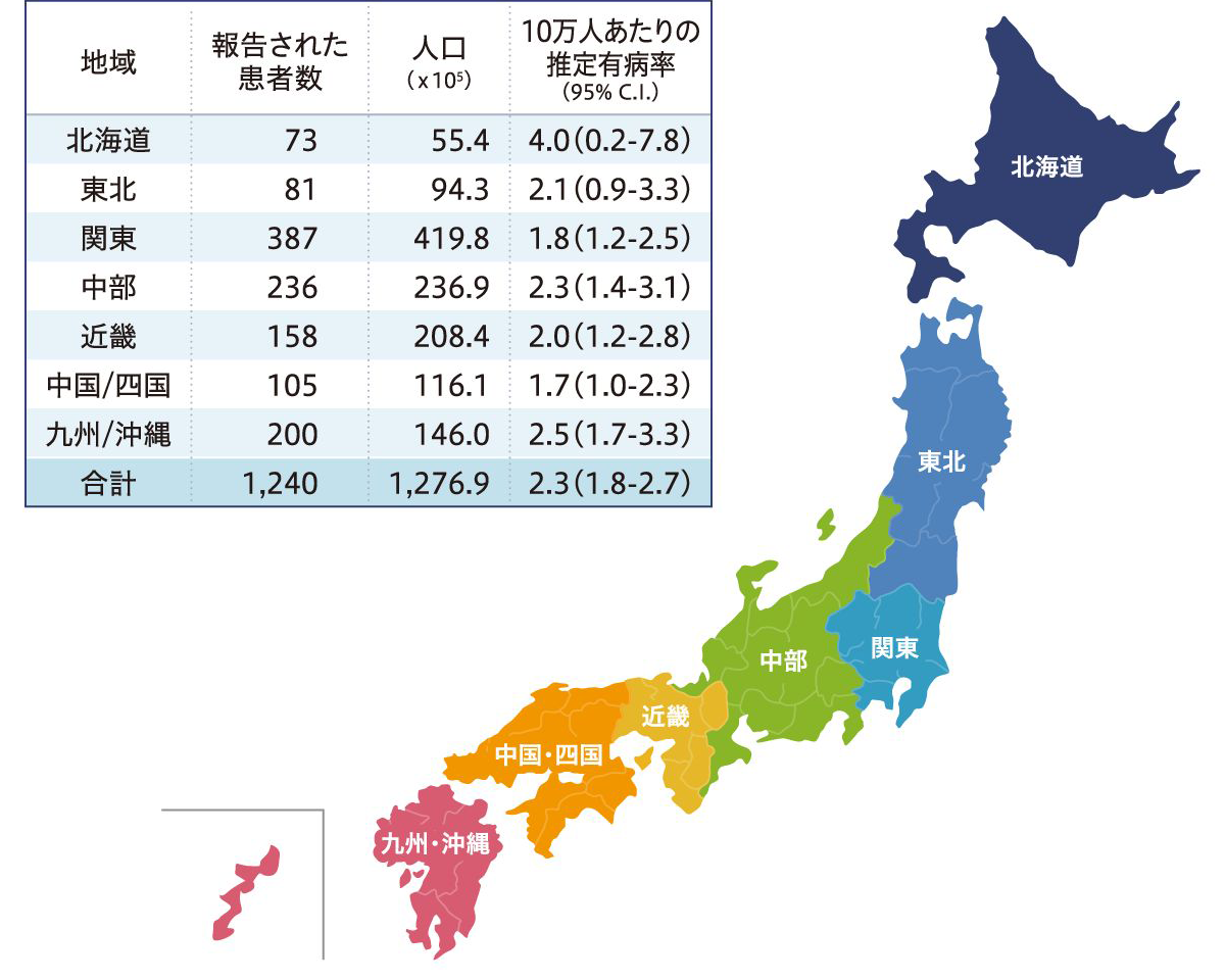日本における有病率は、疫学調査が行われた2007年のアンケート結果では、2.3/10万人3)、2018年のアンケート結果では2.2/10万人の有病率と報告されています4)。